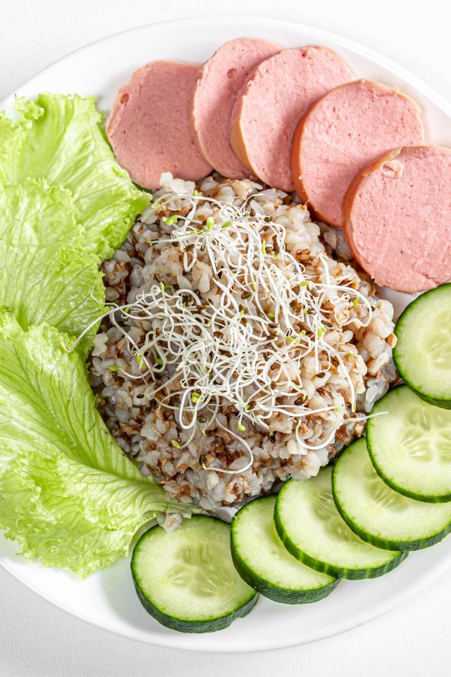Wallpaper Buckwheat on a plate with sausage, cucumbers and lettuce