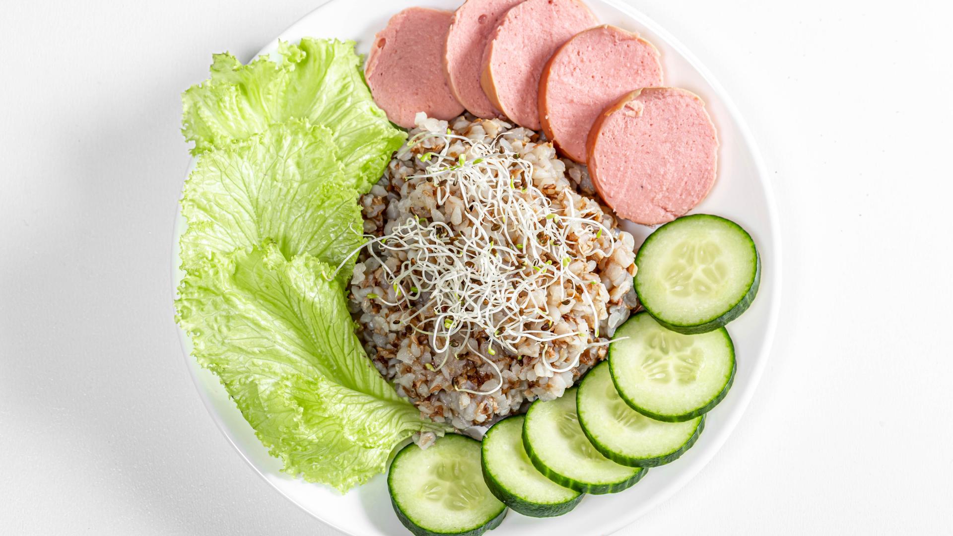 Wallpaper Buckwheat on a plate with sausage, cucumbers and lettuce