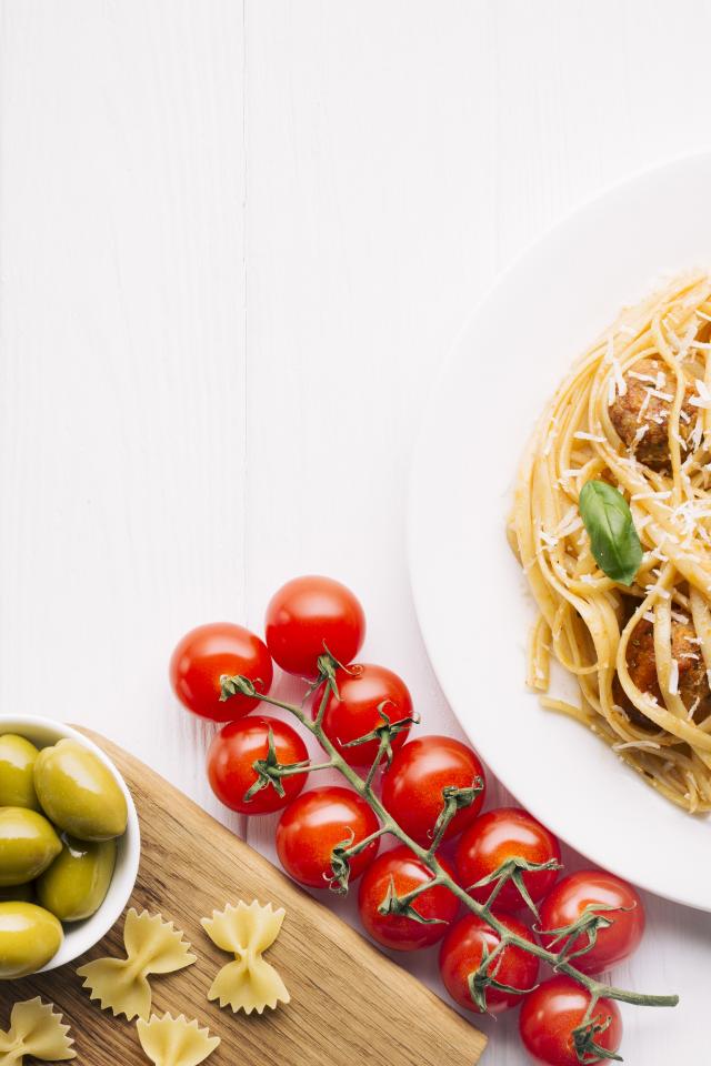 Wallpaper Pasta with meatballs on a table with tomatoes and olives