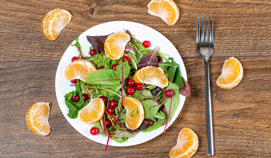 Wallpaper Salad of greens and mandarin on a white plate on a table with a fork