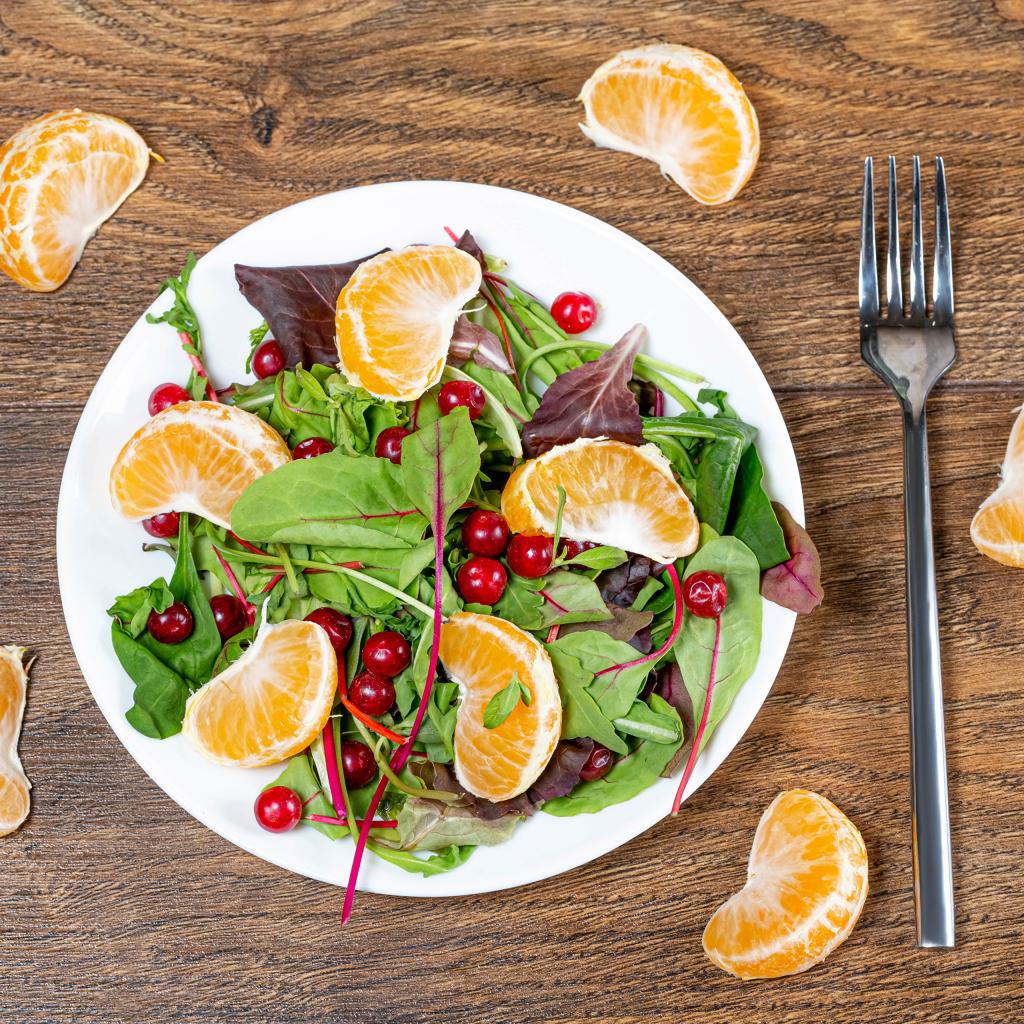 Wallpaper Salad of greens and mandarin on a white plate on a table with a fork