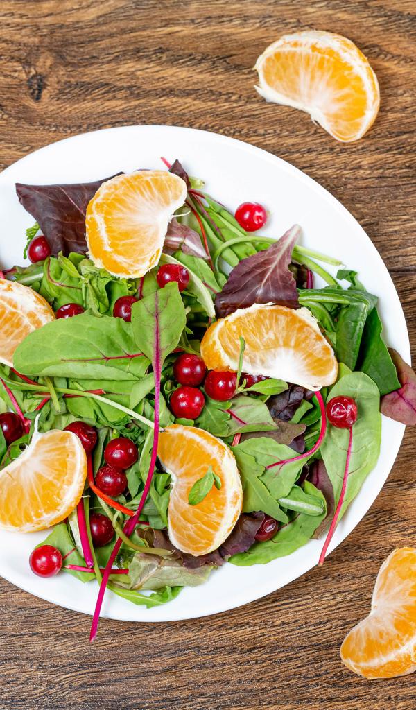 Wallpaper Salad of greens and mandarin on a white plate on a table with a fork