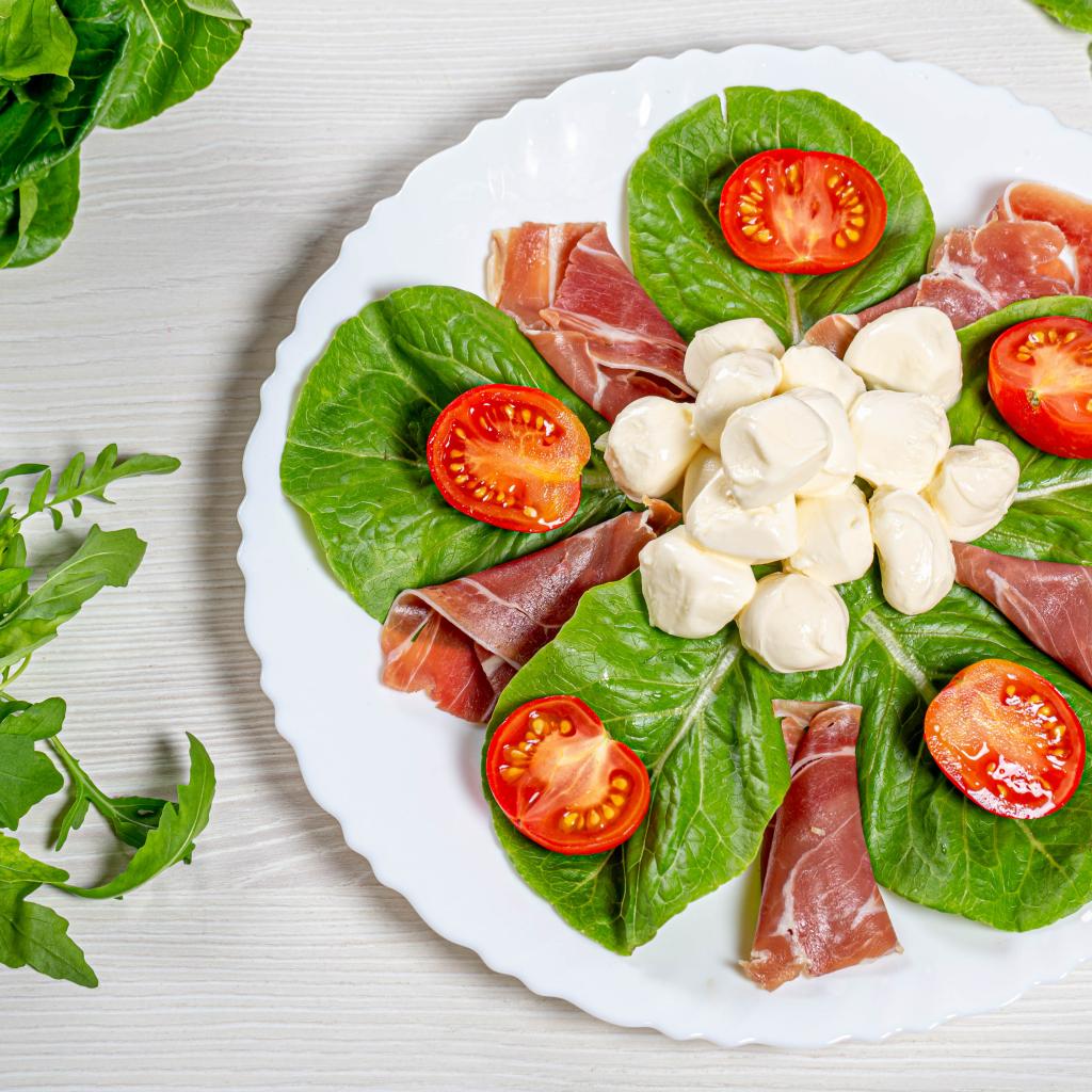 Wallpaper Sliced ham on a plate with cheese, tomatoes and lettuce