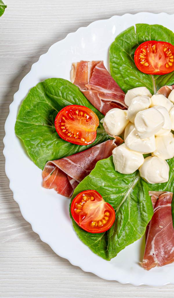 Wallpaper Sliced ham on a plate with cheese, tomatoes and lettuce