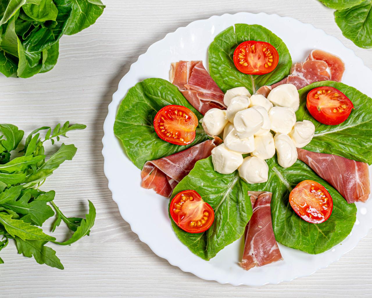 Wallpaper Sliced ham on a plate with cheese, tomatoes and lettuce