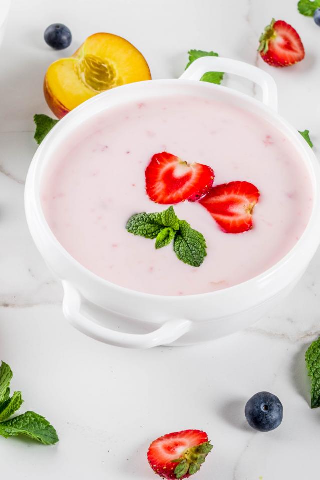 Wallpaper Milk soup in a plate on a table with berries and nectarine