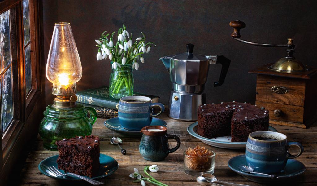 Wallpaper Chocolate cake on a table with coffee, a bouquet of snowdrops and a lamp