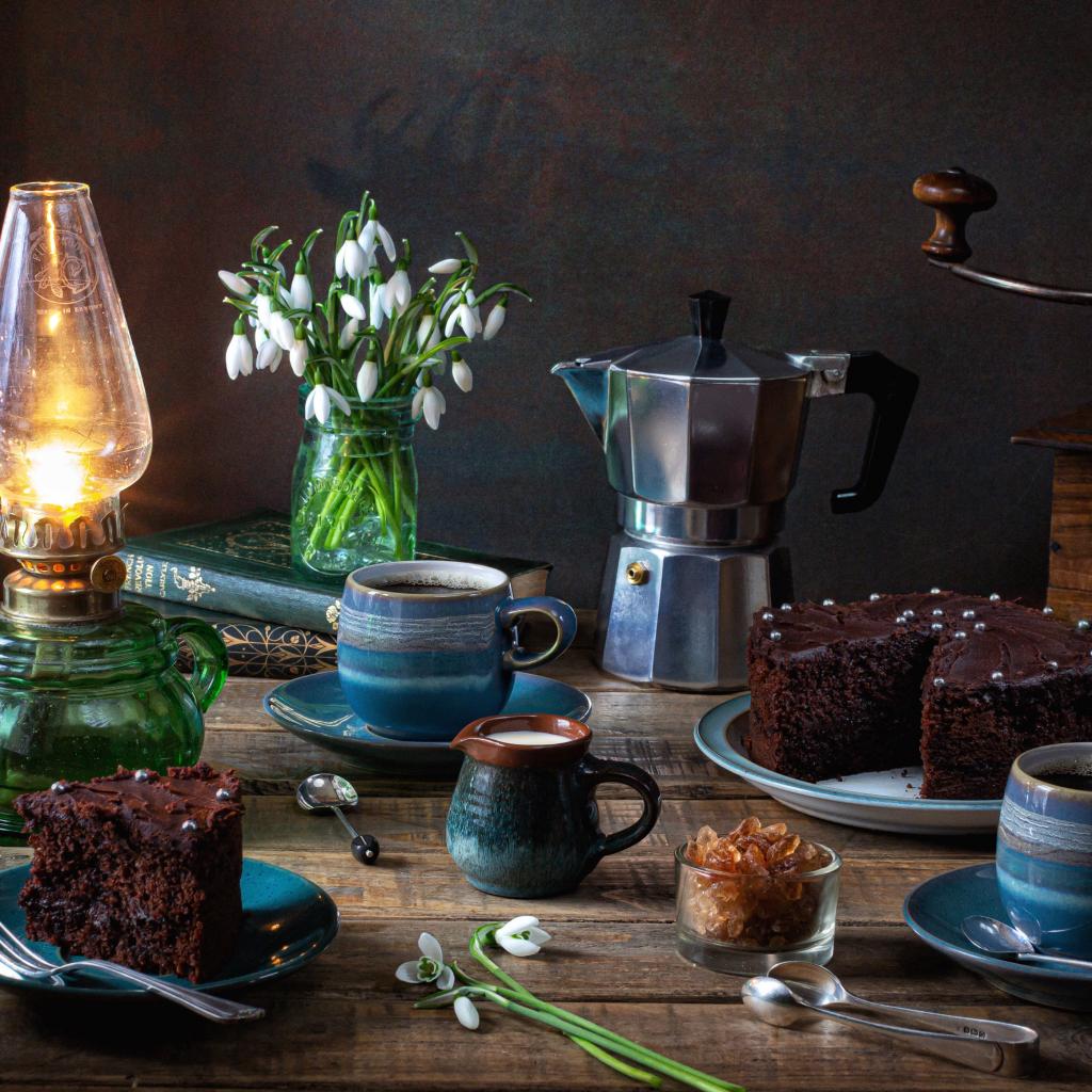 Wallpaper Chocolate cake on a table with coffee, a bouquet of snowdrops and a lamp