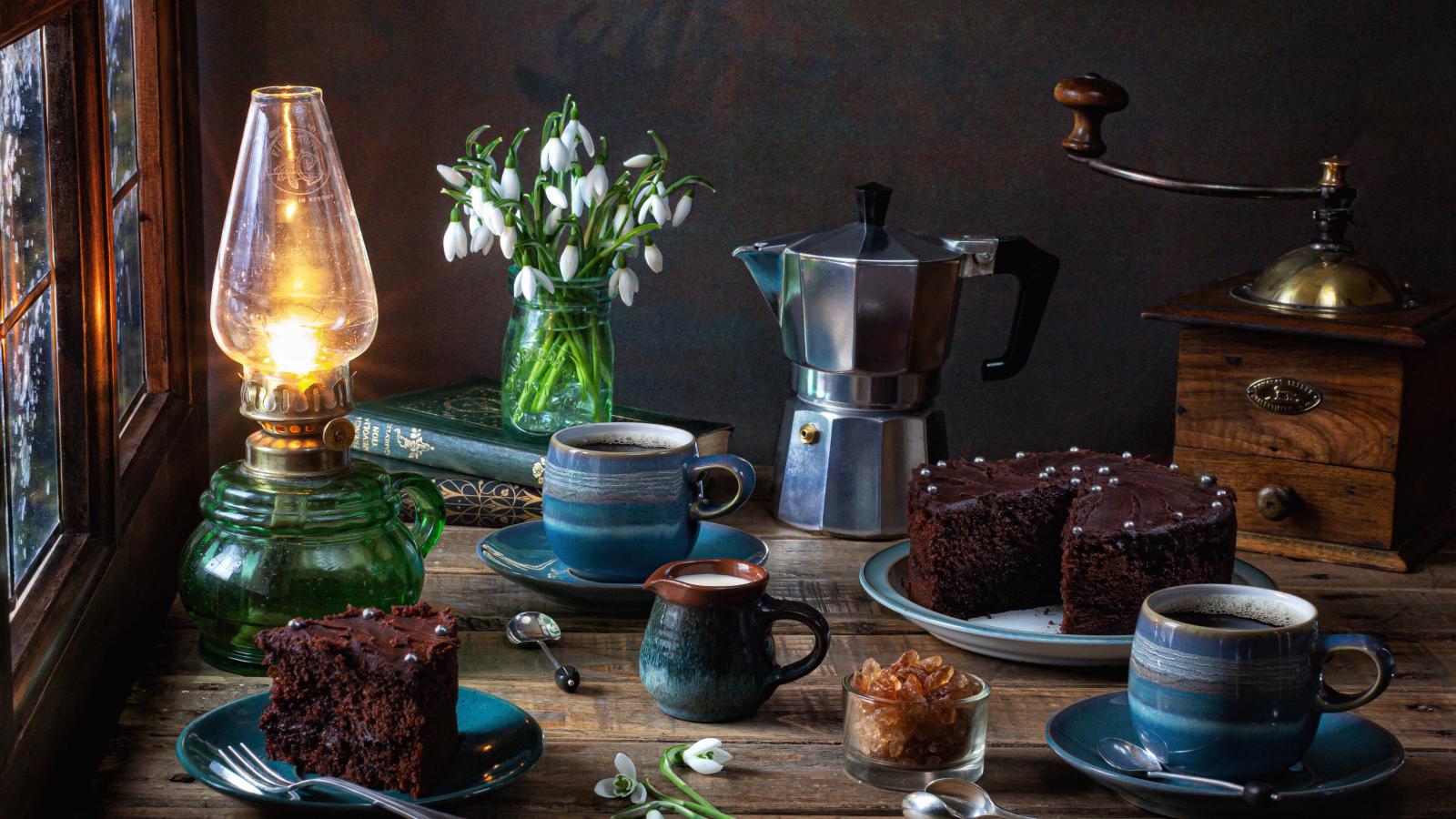 Wallpaper Chocolate cake on a table with coffee, a bouquet of snowdrops and a lamp
