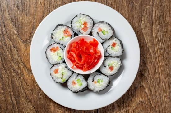 Wallpaper Delicious sushi on a large white plate with ginger