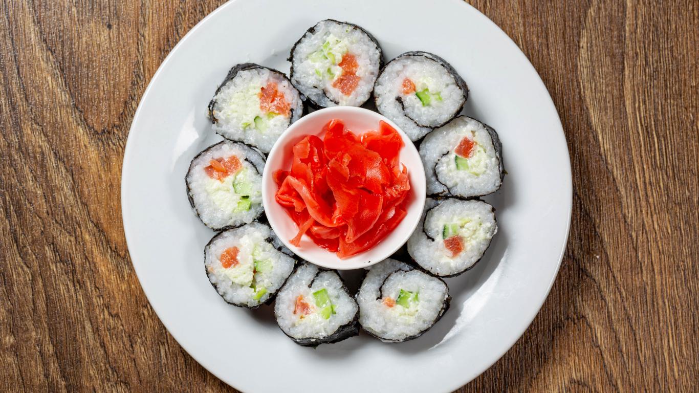 Wallpaper Delicious sushi on a large white plate with ginger