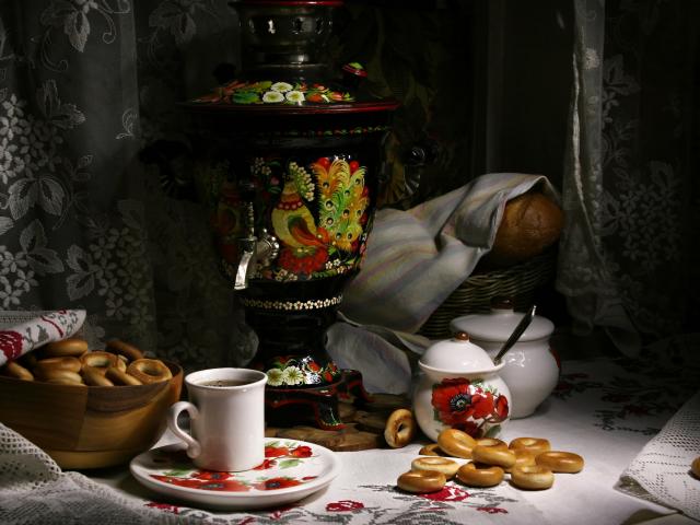 Wallpaper Samovar stands on a table with tea and bagels