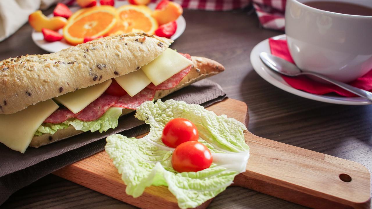 Wallpaper Sandwiches on a table with fruits and a cup of tea