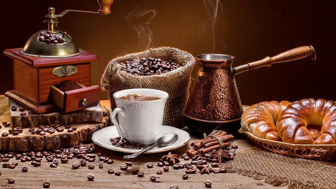 Wallpaper Cup of coffee on the table with croissants and a coffee grinder.