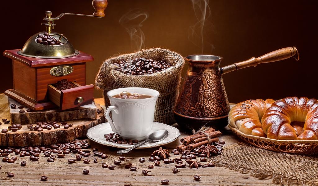 Wallpaper Cup of coffee on the table with croissants and a coffee grinder.