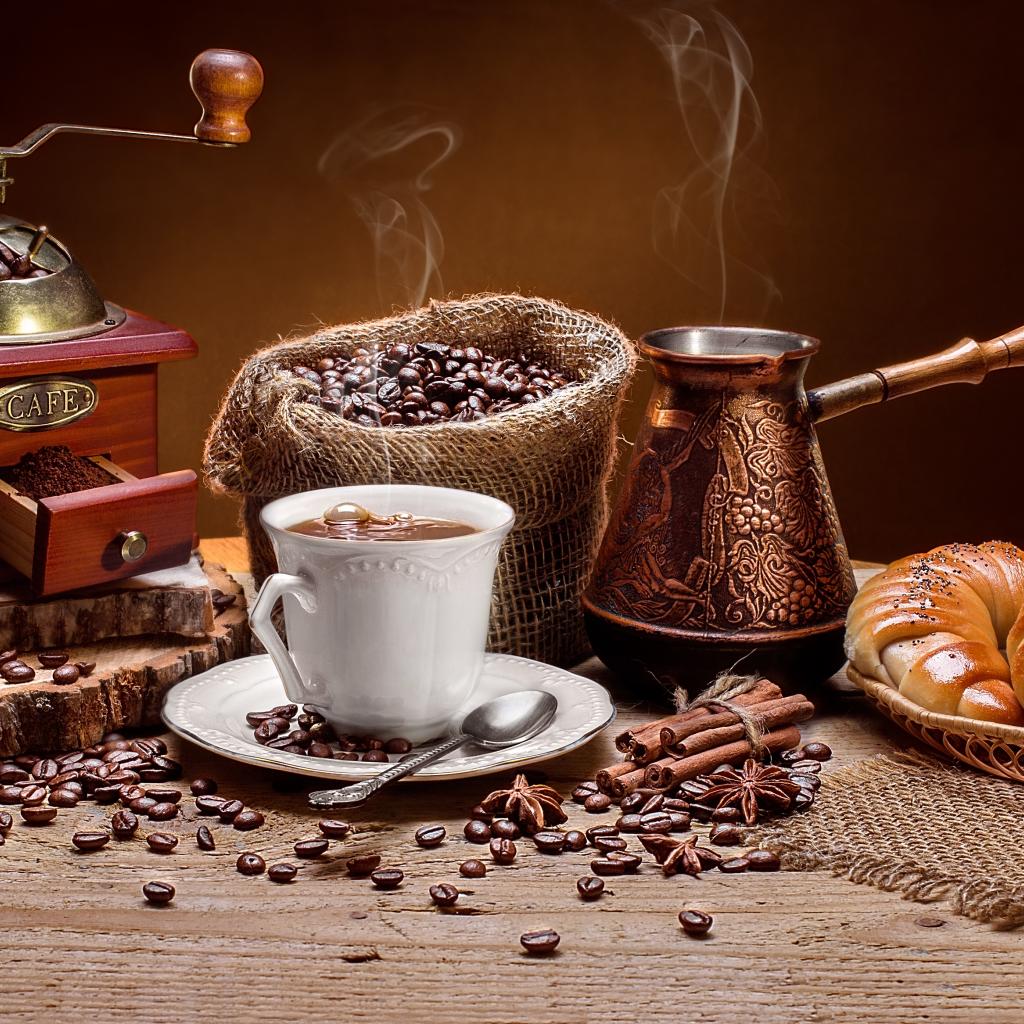 Wallpaper Cup of coffee on the table with croissants and a coffee grinder.