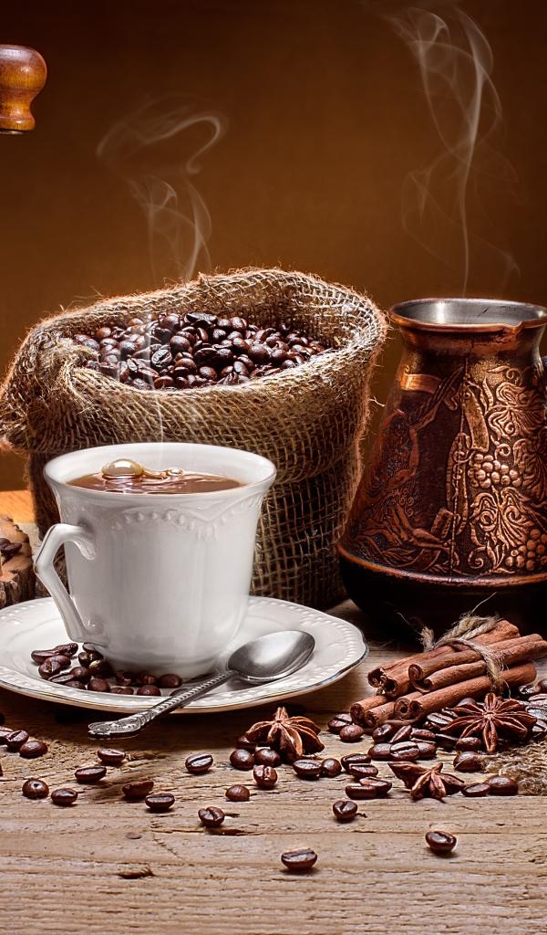 Wallpaper Cup of coffee on the table with croissants and a coffee grinder.
