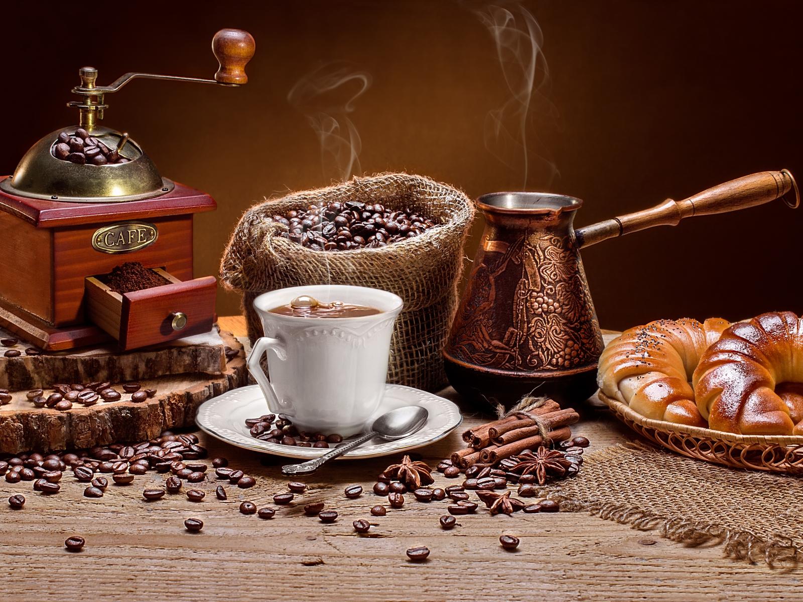 Wallpaper Cup of coffee on the table with croissants and a coffee grinder.