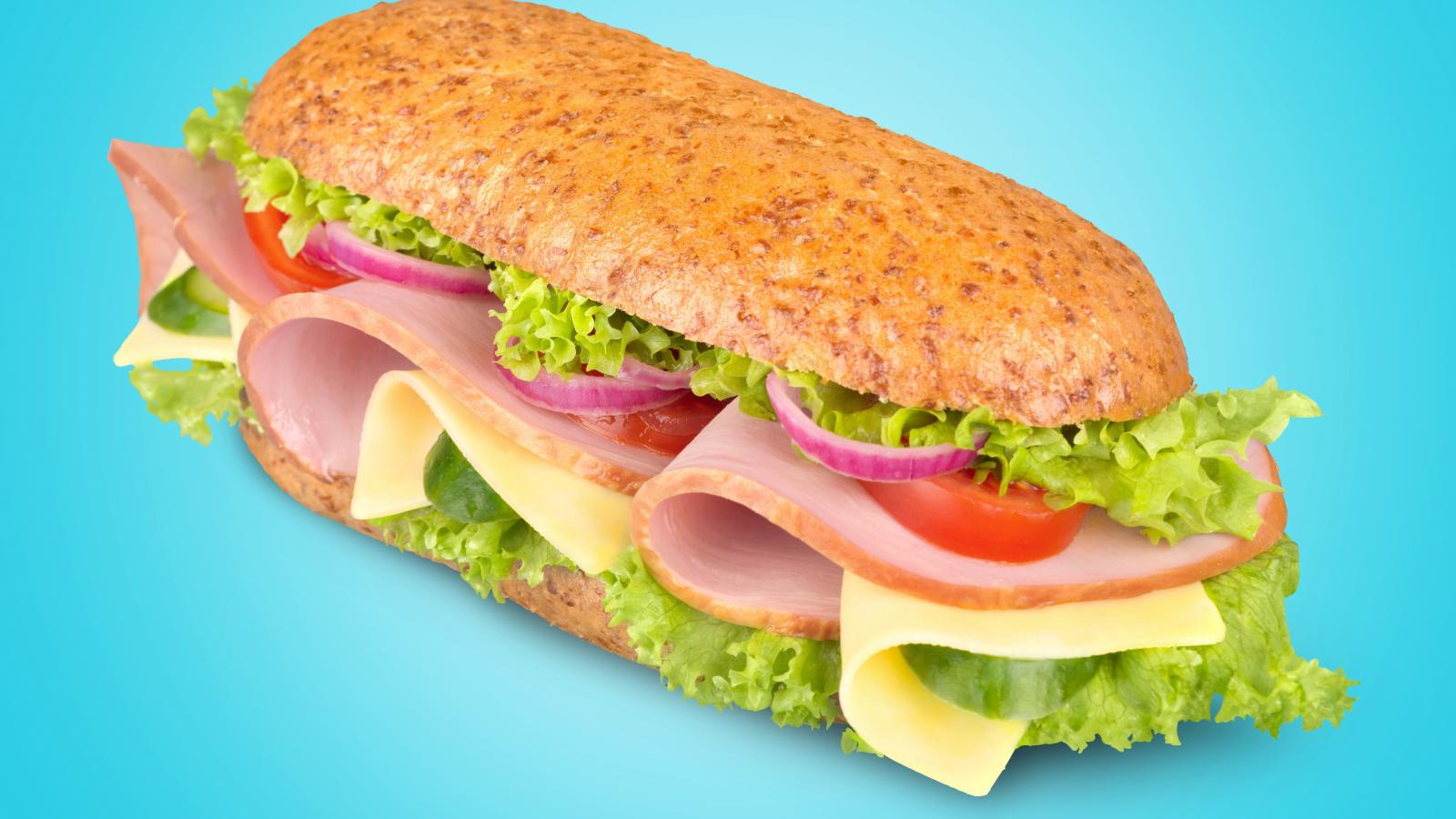 Wallpaper Sandwich with ham, cheese, tomato onions and lettuce on a blue background