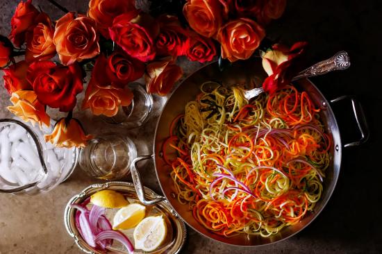 Wallpaper Salad of vegetables on a table with roses