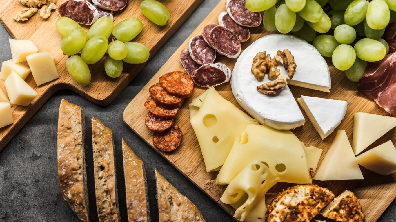 Wallpaper Cheese, sausage, grapes and a long loaf on the table