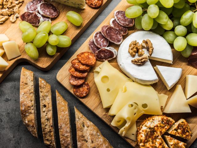 Wallpaper Cheese, sausage, grapes and a long loaf on the table