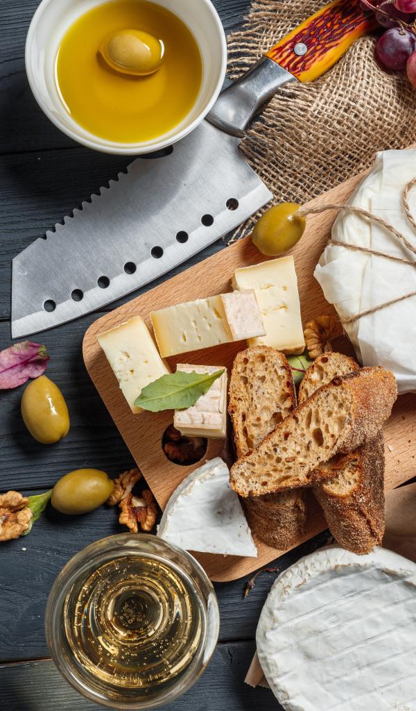 Wallpaper Grapes on a table with cheese, bread and olives