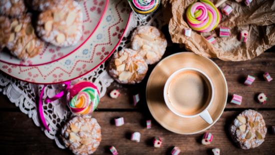 Wallpaper Cup of coffee on the table with cookies and sweets.
