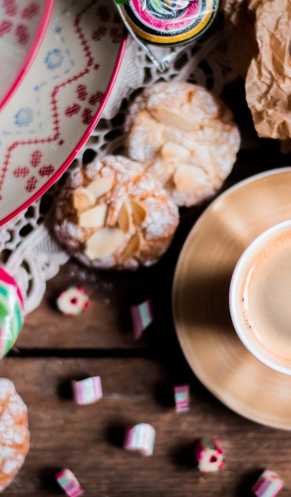 Wallpaper Cup of coffee on the table with cookies and sweets.
