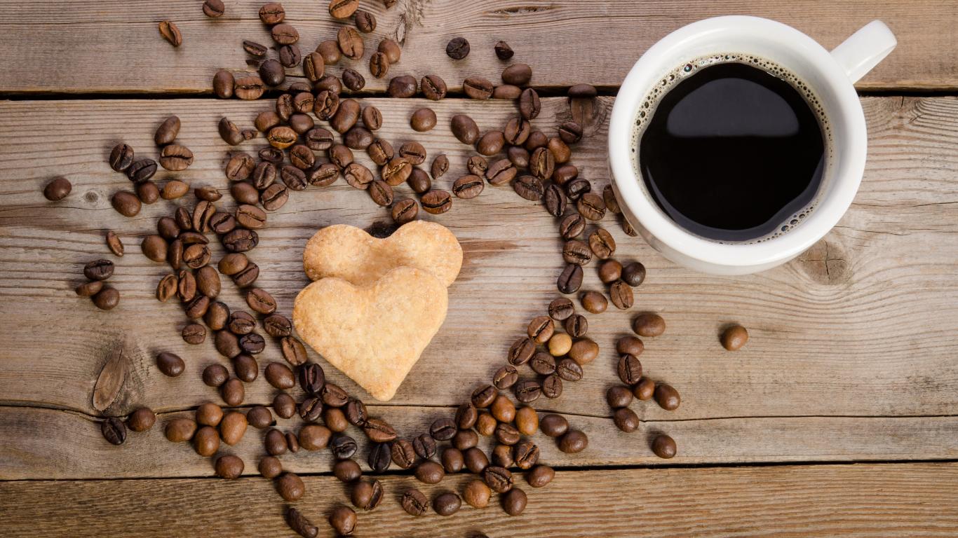 Wallpaper Heart-shaped cookies on a table with grains and a cup of coffee