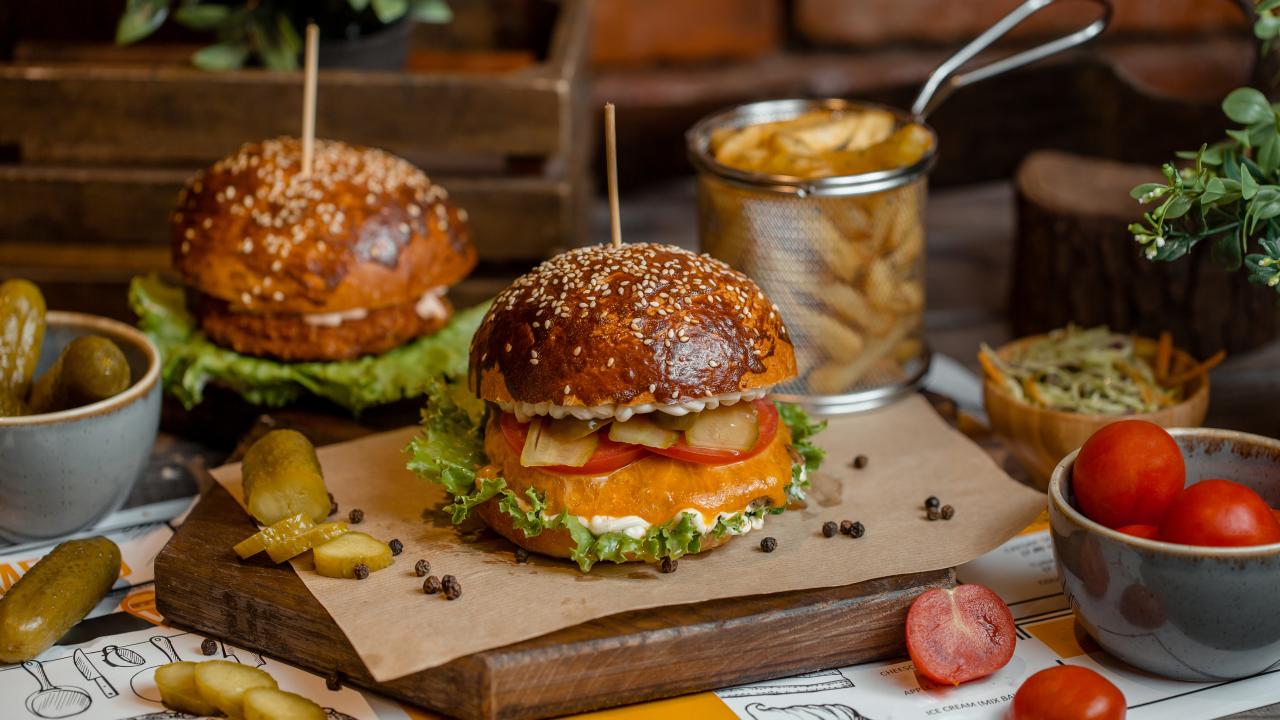 Wallpaper Hamburgers on the table with tomatoes, french fries and pickles