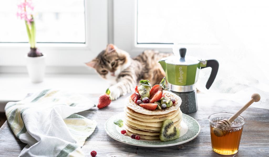 Wallpaper Pancakes on a table with berries, honey and a cat