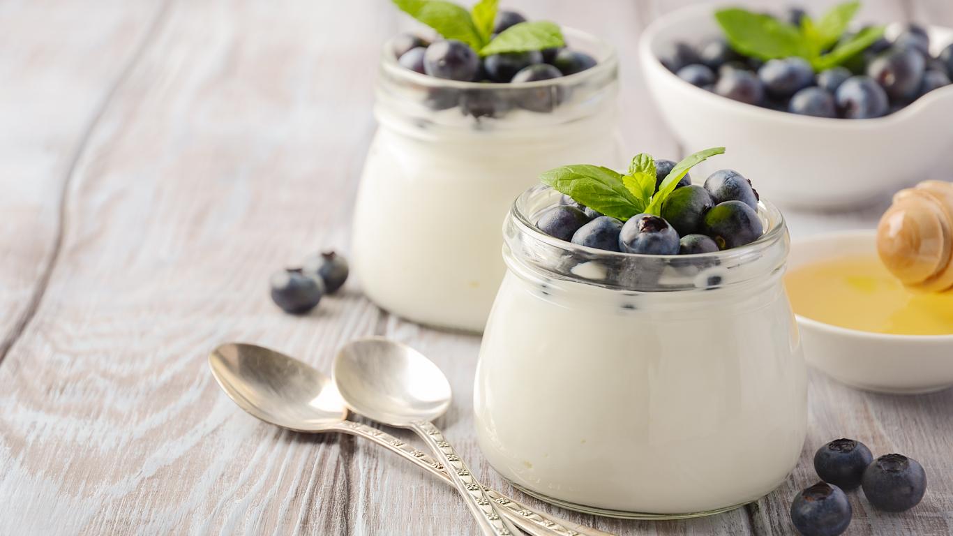 Wallpaper Yogurt in jars with blueberries on a table with spoons and honey