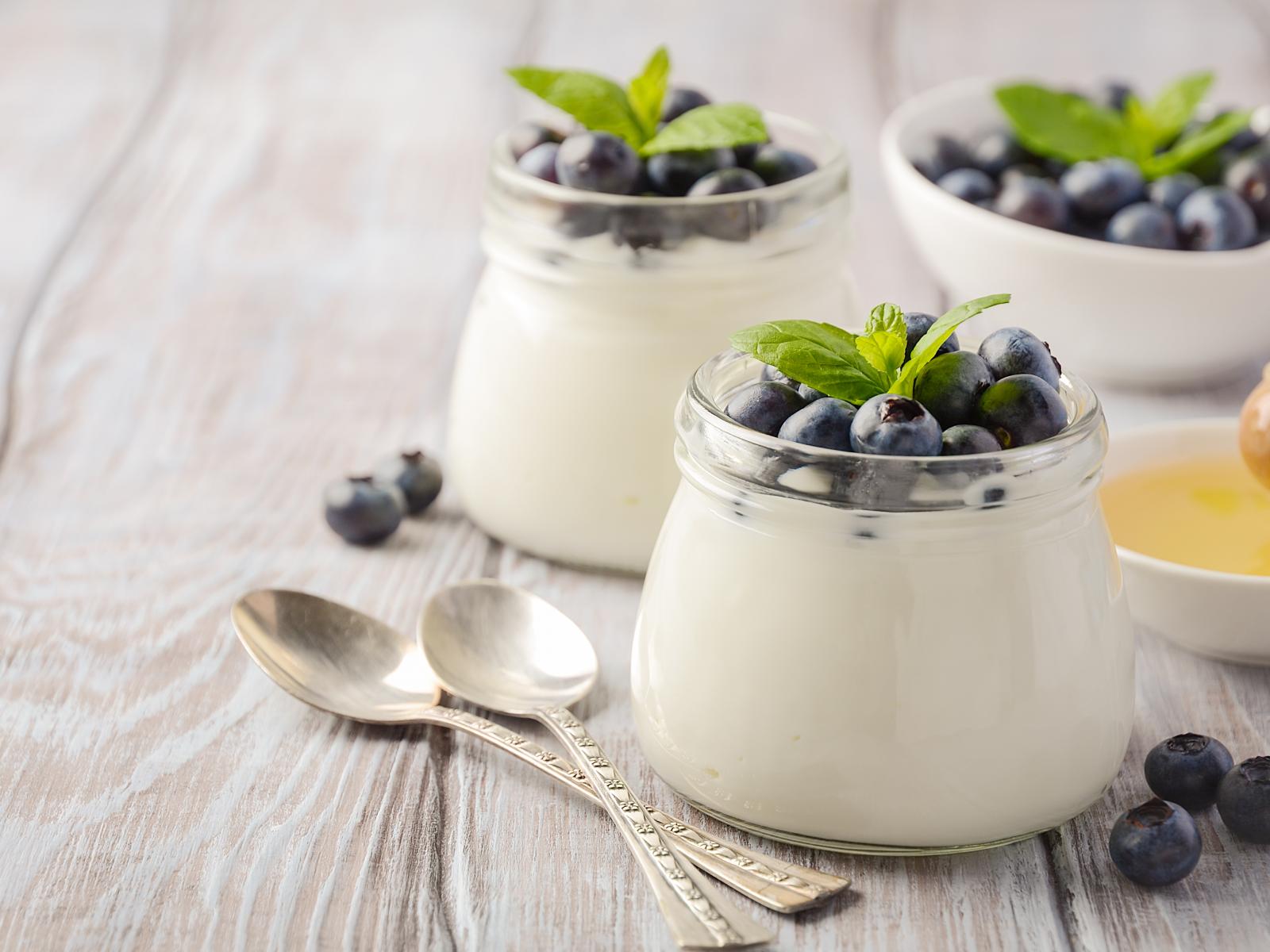 Wallpaper Yogurt in jars with blueberries on a table with spoons and honey