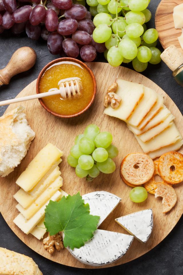 Wallpaper Cheese on a table with grapes, olives and white wine
