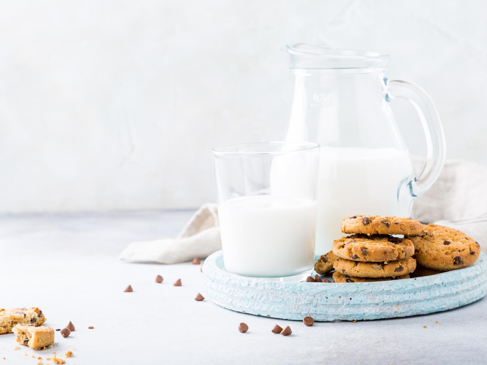 Wallpaper Shortbread cookies with chocolate on a table with milk