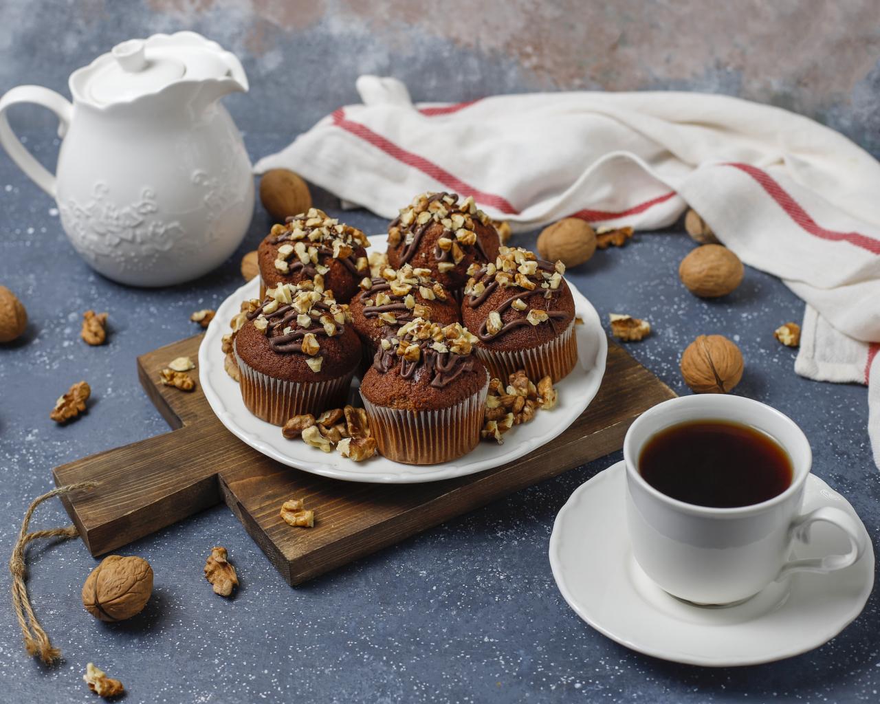 Wallpaper Delicious chocolate muffins with nuts on a table with coffee