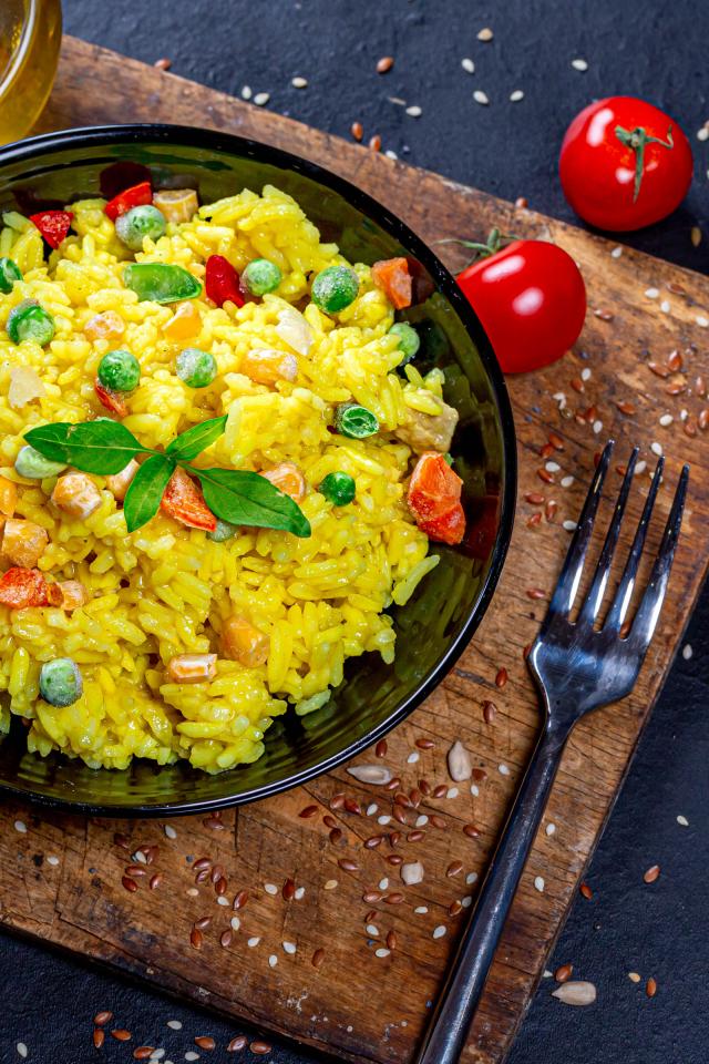 Wallpaper Rice with vegetables on a table with butter, herbs and tomatoes