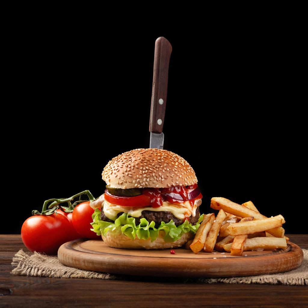Wallpaper Hamburger with a knife on the table with tomatoes and fries