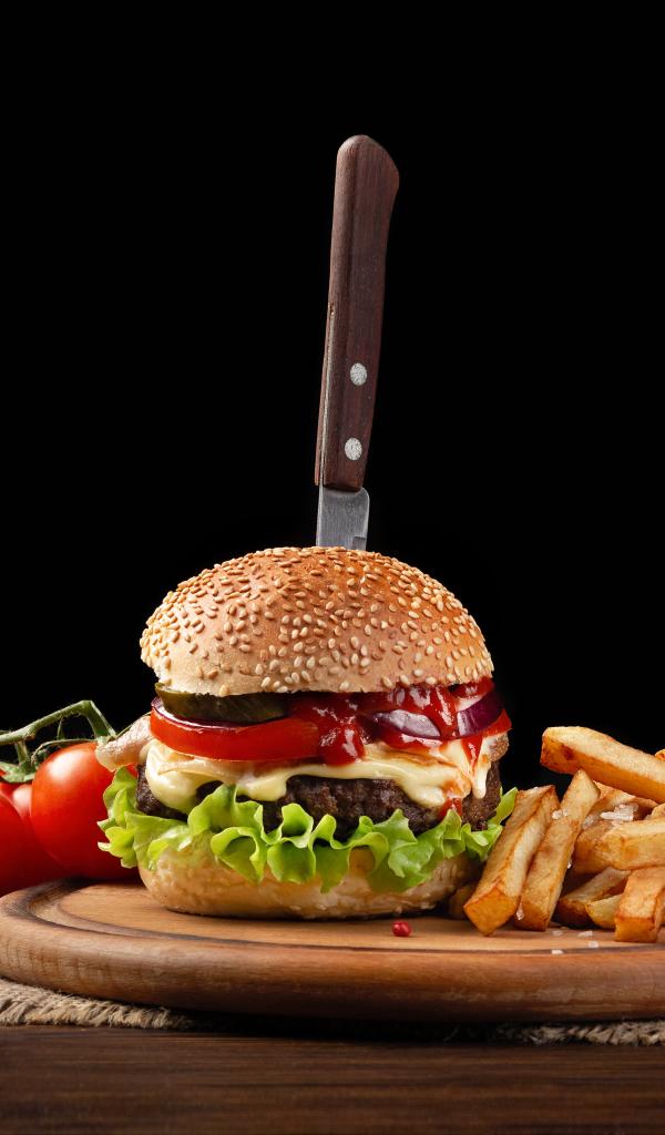 Wallpaper Hamburger with a knife on the table with tomatoes and fries
