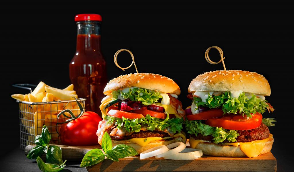 Wallpaper Hamburgers on the table with potatoes and ketchup on a black background