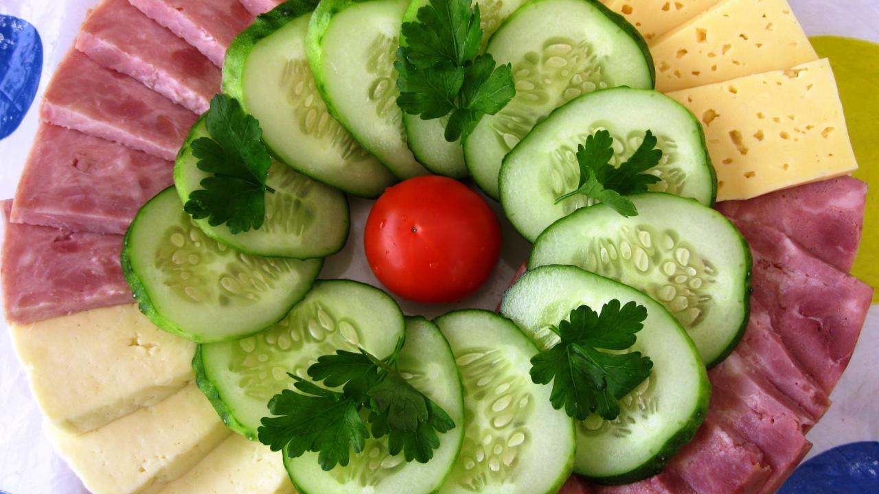 » Wallpaper Sliced cheese, cucumbers and ham on a plate