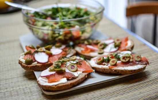 Wallpaper Sandwiches with butter and red fish on a table with salad