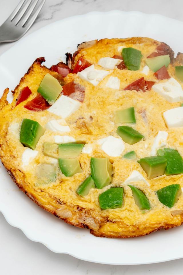 Wallpaper Omelet with avocado and slices of tomato on a white plate