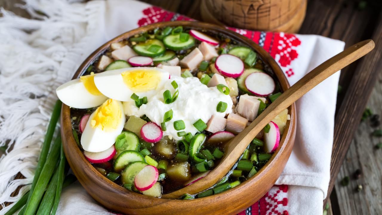 Wallpaper Cold okroshka in a wooden bowl on the table