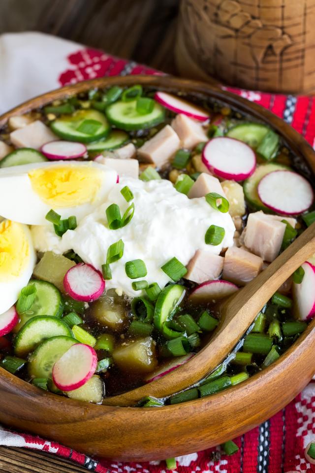 Wallpaper Cold okroshka in a wooden bowl on the table