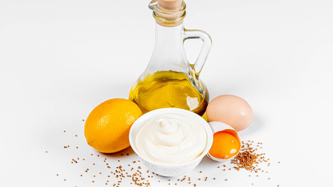 Wallpaper Olive oil, eggs and lemon on a white plate with mayonnaise