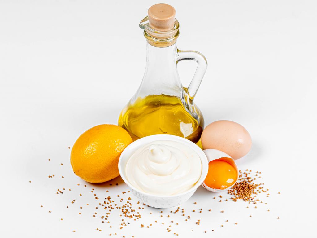 Wallpaper Olive oil, eggs and lemon on a white plate with mayonnaise