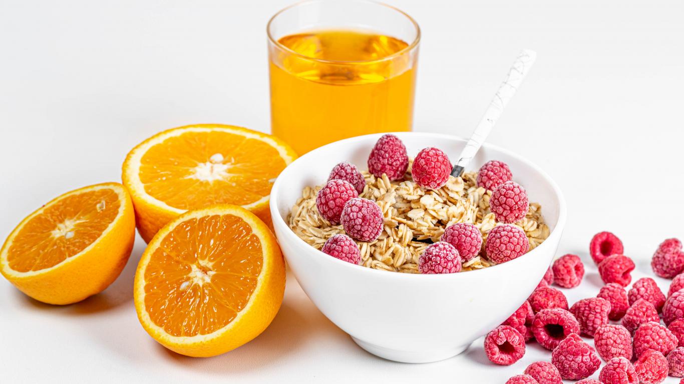 Wallpaper Bowl of muesli with raspberries and oranges on a table with juice