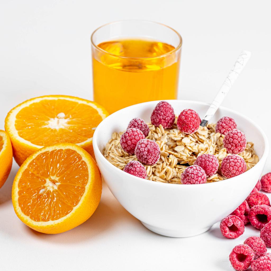 Wallpaper Bowl of muesli with raspberries and oranges on a table with juice